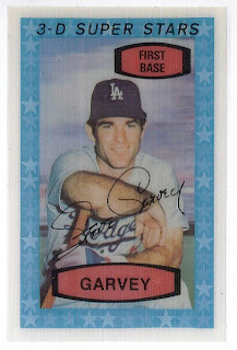 This is the first Steve Garvey card that I owned. I remember how I acquired it as I didn't pull it out of a pack. I was over at a friend's house and I traded him a bunch of cards (to get this one card) that I couldn't tell you today other than a 1976 Topps George Brett and Hank Aaron. While the trade today seems like a complete ripoff back in 1976 it was pretty fair in my mind because I was living in the San Fernando Valley which is the epicenter of the Dodgers L.A. fanbase and getting someone to trade you a Dodgers card much less Garvey was next to impossible.